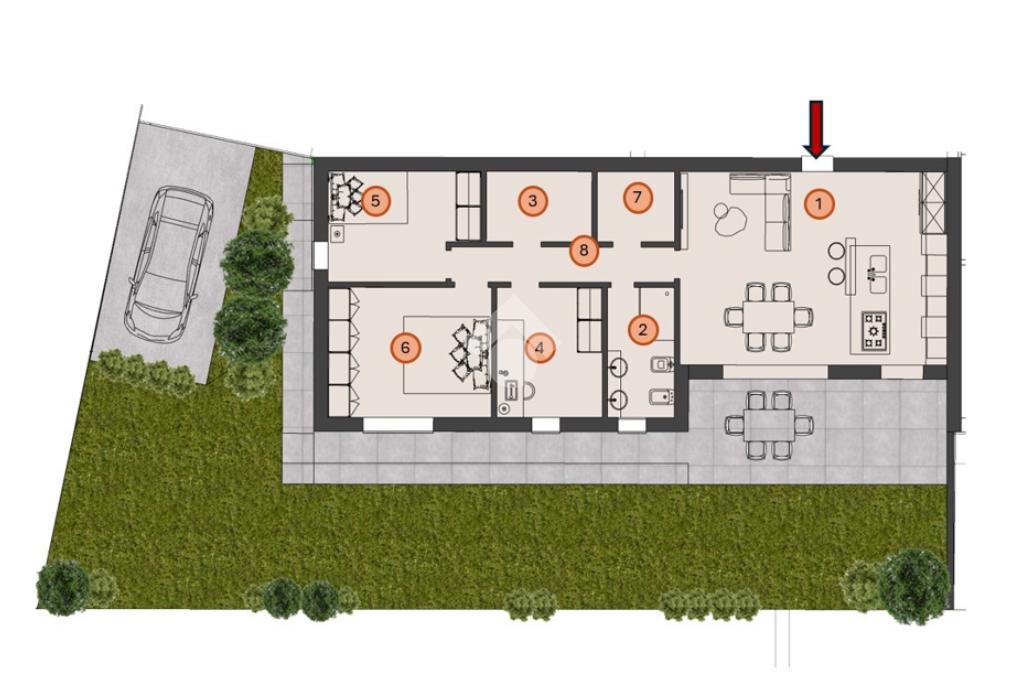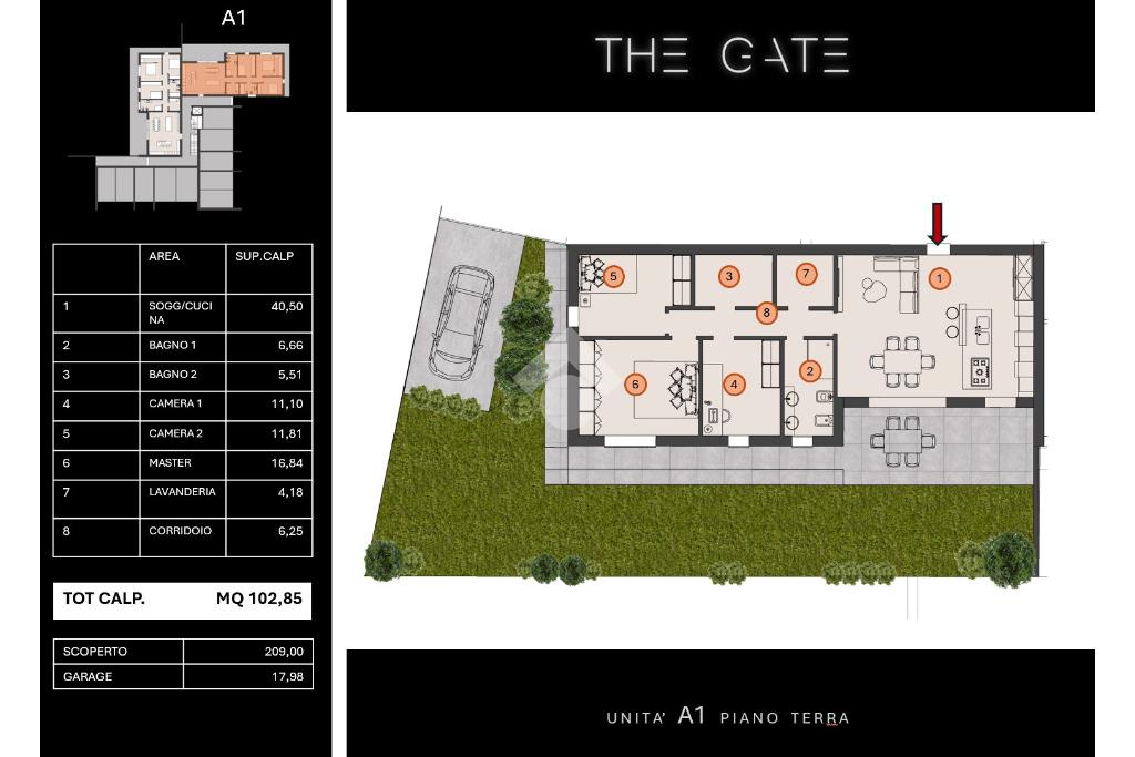 La soluzione proposta è un quadrilocale al pian terreno, caratterizzato da un’ampia zona living di 40 mq, tre camere da letto di cui la padronale di oltre 16 mq, due bagni ed un vano tecnico adibito a lavanderia.