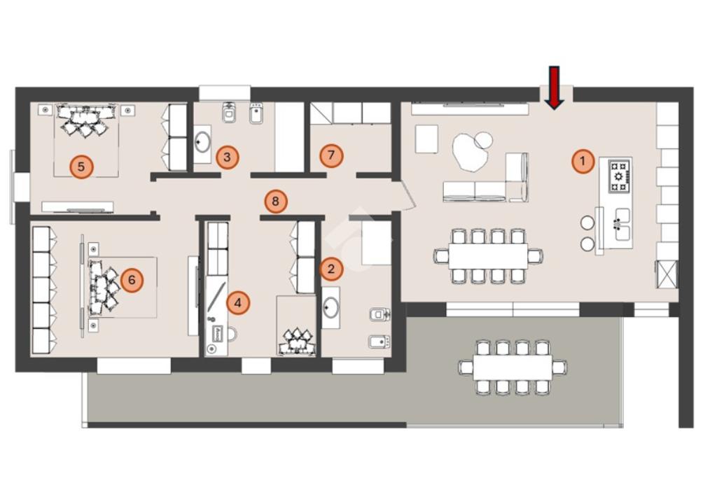 La soluzione proposta è un attico al piano secondo, dotato di ascensore, caratterizzato da un’ampia zona living di 40 mq, tre camere da letto di cui la padronale di oltre 16 mq, due bagni ed un vano tecnico adibito a lavanderia.